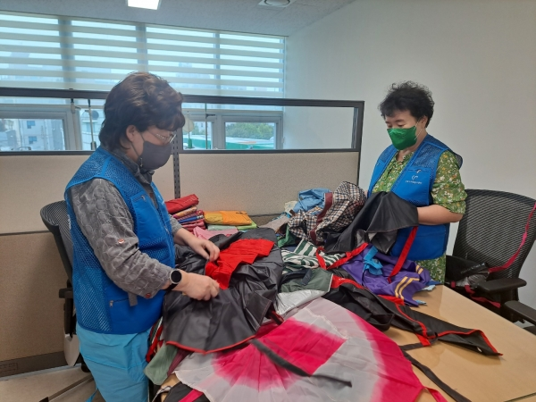 인천시 남동구자원봉사센터는 폐우산 천을 재활용해 방수 앞치마 180여 개를 제작했다고 28일 밝혔다. (이하생략)