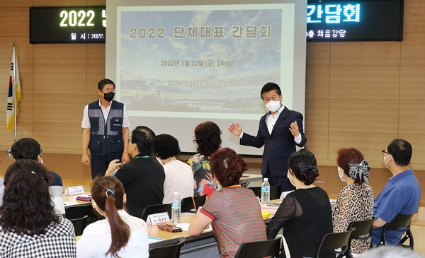 인천 남동구자원봉사센터(센터장·박위광)는 최근 남동구 평생학습관 채움 강당에서 박종효 구청장과 지역 자원봉사단체 대표 90여 명이 참석한 가운데 간담회를 진행했다고 25일 밝혔다.(이하생략)