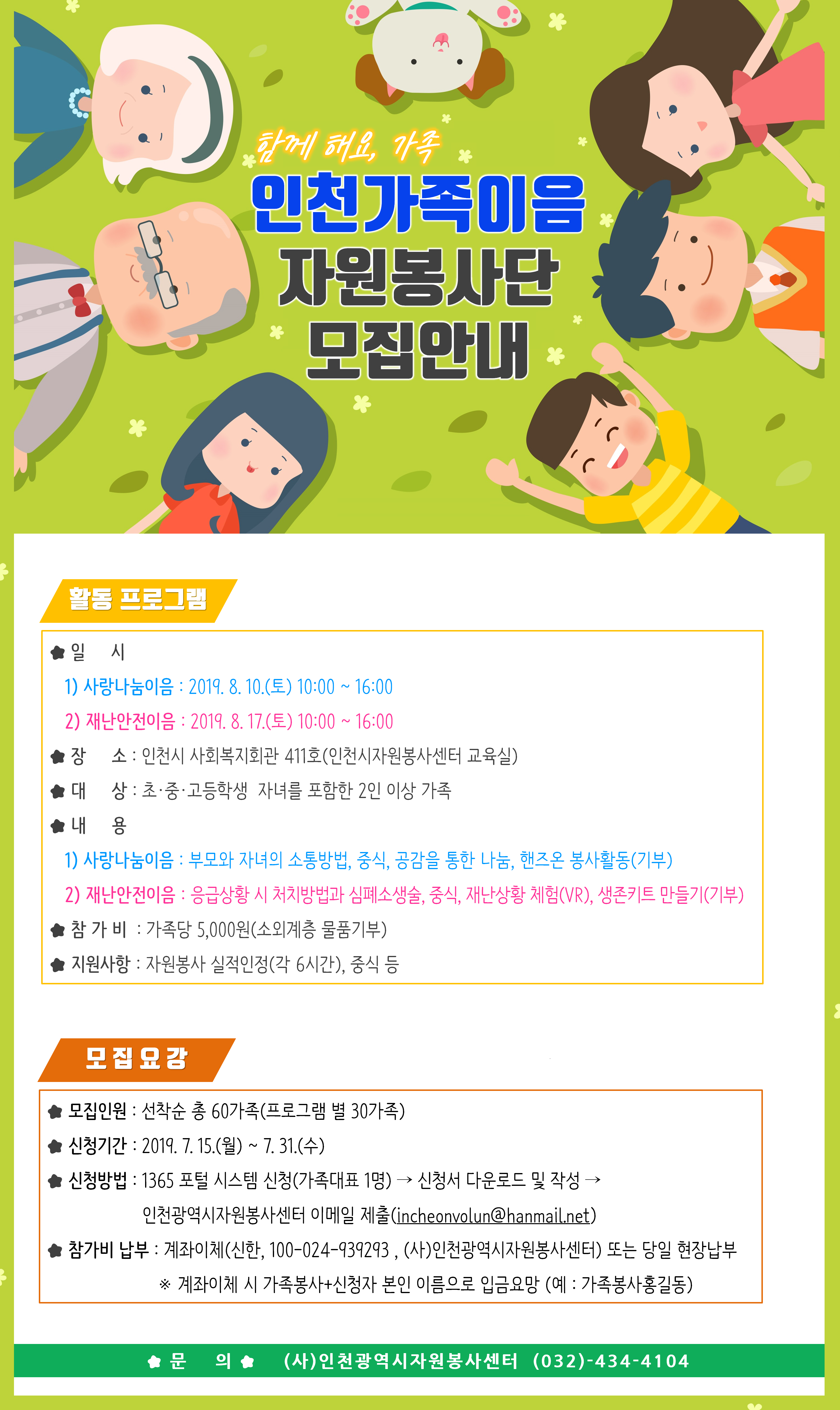 (사)인천광역시자원봉사센터에서는 자원봉사활동을 통한 가족간 유대강화 및 자원봉사참여 활성화를 위해 자원봉사단을 모집하오니 많은 참여부탁드립니다.